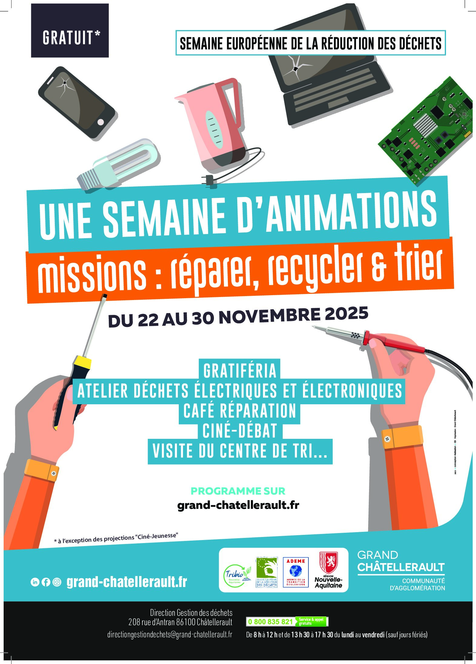 A l'occasion de La Semaine Européenne de la Réduction des Déchets du 22 au 30 novembre 2025, et dans le cadre de sa politique Zéro Déchet, la Direction Gestion des déchets de la Communauté d’Agglomération de Grand Châtellerault se mobilise afin de sensibiliser les habitants du territoire à la réduction des déchets.